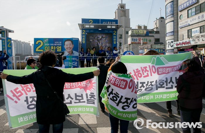 | △ 더민주 유세 찾은 칠보산 화장장 건립저지 비대위 |