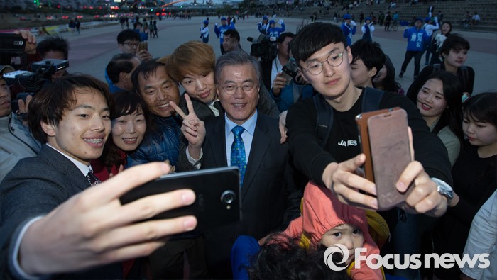 (청주=포커스뉴스) 문재인 더불어민주당 전 대표가 4일 오후 충북 청주 무심천인라인스케이트장에서 시민들과 셀카를 찍고 있다.