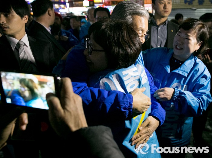 (안양=포커스뉴스) 4일 오후 경기도 지하철 1호선 안양역 앞 광장에서 선거유세를 마친 김종인 더불어민주당 비대위 대표 겸 선대위원장이 안양 만안구 후보인 이종걸 원내대표의 지지자들과 포옹을 하고 있다.