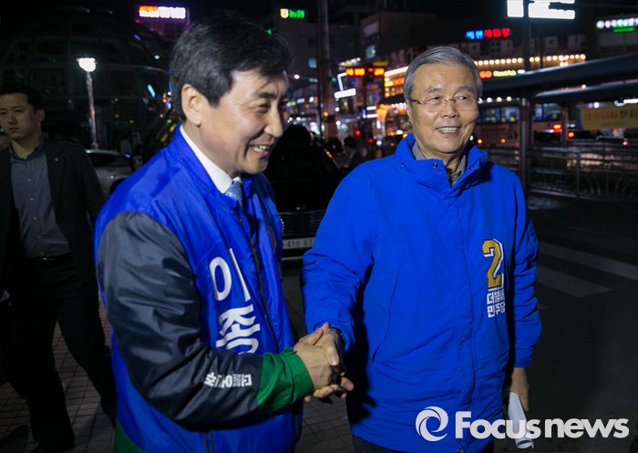 (안양=포커스뉴스) 4일 오후 경기도 지하철 1호선 안양역 앞 광장에서 김종인(오른쪽) 더불어민주당 비대위 대표 겸 선대위원장이 안양만안구 후보인 이종걸 원내대표의 지원유세에 앞서 이 원내대표와 악수하고 있다.