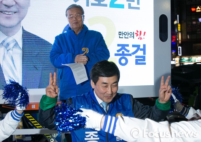 (안양=포커스뉴스) 4일 오후 경기도 지하철 1호선 안양역 앞 광장에 김종인(뒤) 더불어민주당 비대위 대표 겸 선대위원장이 안양 만안구 후보인 이종걸 원내대표의 선거율동을 추는 모습을 바라보고 있다.