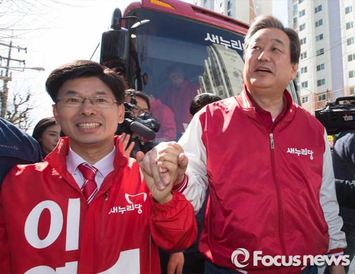 (대전=포커스뉴스) 김무성 새누리당 대표 최고위원이 5일 오전 대전 서구 한민시장 일원에서 이영규 후보의 손을 잡고 있다.