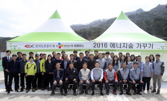 CJ대한통운 관계자는 "여러 주체들이 뜻을 모아 온실가스 흡수와 환경 보전, 소외계층 지원에 노력하고 있으며, 연속성을 갖는다는 점에서 더욱 뜻깊은 사업"이라고 밝혔다.도로공사 김경일 품질환경처장(앞줄 왼쪽 3번째)과 CJ대한통운 신동휘 부사장(앞줄 왼쪽 4번째)을 비롯한 양사 임직원들이 '에너지숲 가꾸기' 행사에 앞서 기념촬영을 하고 있다.