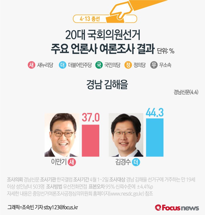 (서울=포커스뉴스) 경남신문이 여론조사기관 한국갤럽에 의뢰해 4일 발표한 결과에 따르면 경남 김해을에서 새누리당 이만기 후보의 지지율은 37.0%, 더민주 김경수 후보의 지지율은 44.3%안 것으로 나타났다.
