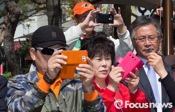 (대전=포커스뉴스) 5일 오전 대전 유성구 족욕체험장 일원에서 시민들이 김무성 새누리당 대표의 지원유세를 핸드폰을 촬영하고 있다.