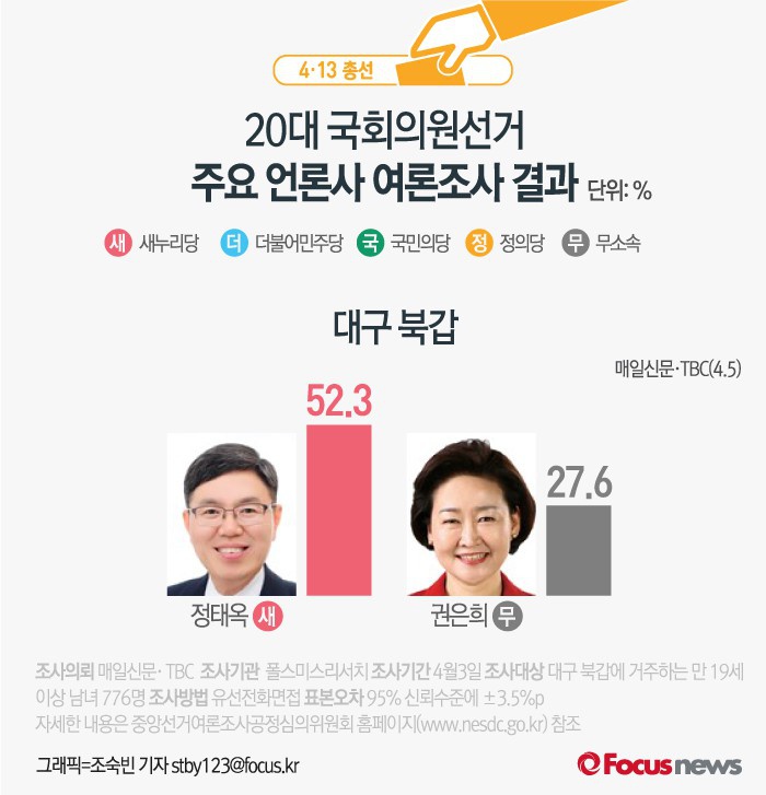 (서울=포커스뉴스) 매일신문과 TBC가 공동으로 여론조사기관 폴스미스 리서치에 의뢰해 5일 발표한 결과에 따르면 정태옥 후보가 52.3%를 기록해 권은희 후보(27.6%)와 24.7%p차를 보이고 있다.