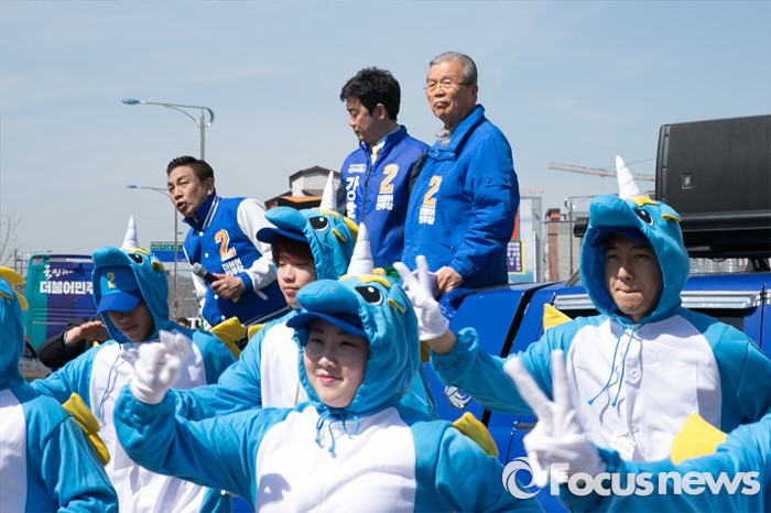 (아산=포커스뉴스) 5일 오전 충남 아산시 배방읍사무소 앞 사거리에서 김종인 더불어민주당 비대위 대표 겸 선대위원장이 강훈식 아산을 후보의 지지를 호소하고 있다.