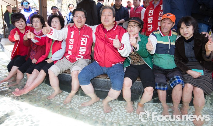 (대전=포커스뉴스) 김무성 새누리당 대표가 5일 오전 대전 유성구 족욕체험장에서 지원유세 중 족욕을 하며 진동규 후보의 지지를 호소하고 있다.