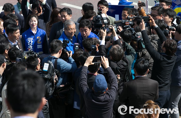 (아산=포커스뉴스) 5일 오전 충남 아산시 배방읍사무소 앞 사거리에서 김종인(왼쪽) 더불어민주당 비대위 대표 겸 선대위원장과 강훈식 아산을 후보가 유세를 마친 뒤 시민 및 지지자들과 인사하며 지지를 호소하고 있다.