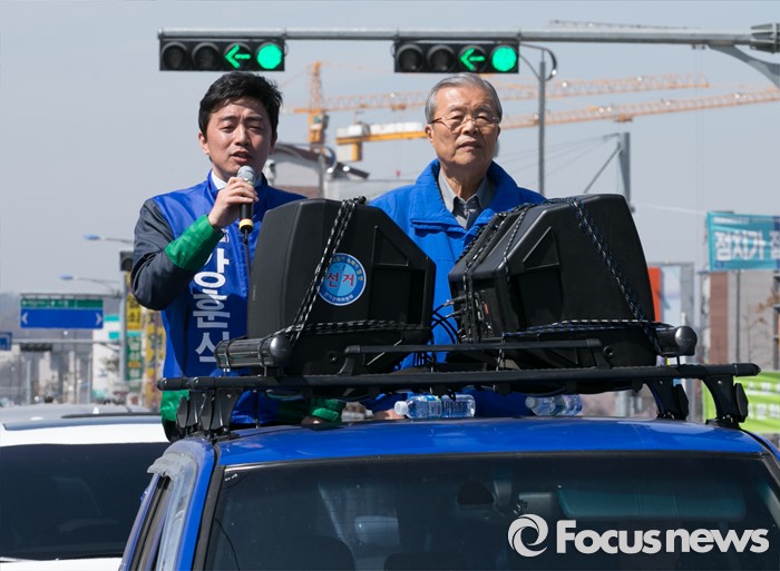 | △ 유세차량 오른 김종인-강훈식 |