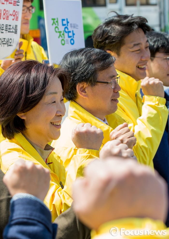 (서울=포커스뉴스) 5일 오전 서울 종로구 성균관대학교 정문 앞에서 윤공규 종로구 후보 지원유세에 나선 심상정(왼쪽부터) 정의당 상임선거대책위원장, 윤 후보. 조성주 비례후보가 대학생들과 기념촬영을 갖고 있다.