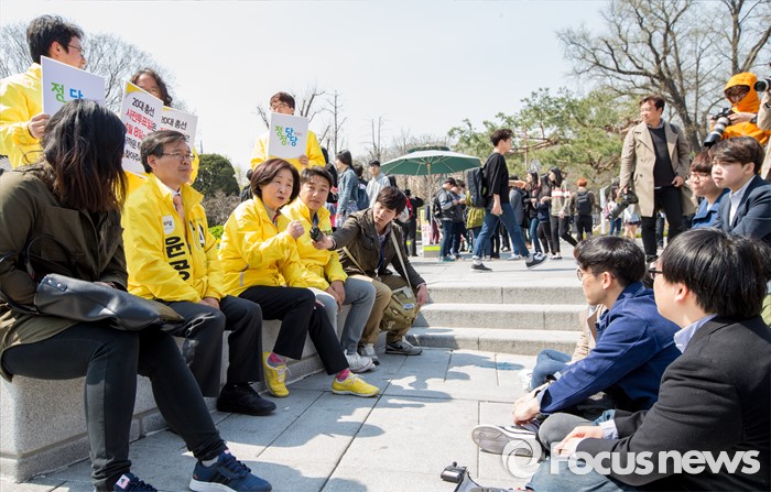 (서울=포커스뉴스) 5일 오전 서울 종로구 성균관대학교 정문 앞에서 윤공규 종로구 후보 지원유세에 나선 심상정 정의당 상임선거대책위원장이 대학생들과 간담회를 하고 있다.
