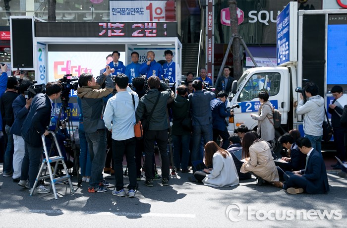 (천안=포커스뉴스) 5일 오전 충남 천안시 신세계백화점 앞에서 열린 더불어민주당 천안지역 합동유세에 참석한 김종인 비대위 대표 겸 선대위원장과 후보들이 지지를 호소하고 있다.