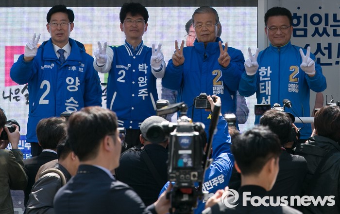(천안=포커스뉴스) 5일 오전 충남 천안시 신세계백화점 앞에서 열린 더불어민주당 천안지역 합동유세에 참석한 김종인 비대위 대표 겸 선대위원장과 후보들이 지지를 호소하고 있다. 왼쪽부터 양승조 천안병, 박완주 천안을 후보, 김 대표, 한태선 천안갑 후보.