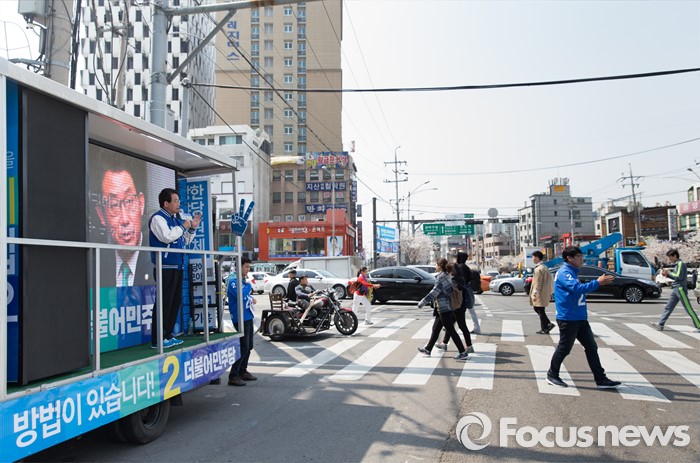 (서울=포커스뉴스) 5일 오후 서울 관악구 서울대입구역 인근에서 유기홍 더불어민주당 관악구갑 후보가 선거유세를 하고 있다.