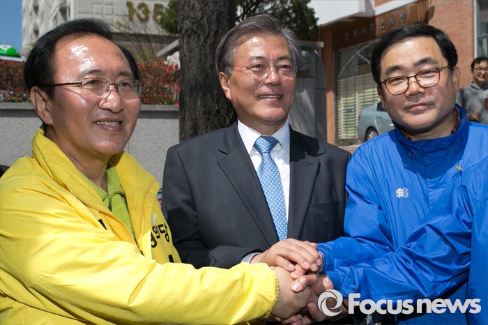 (창원=포커스뉴스) 문재인(가운데) 전 더불어민주당 대표가 5일 오후 경남 창원시 성산구 반송시장에서 노회찬(왼쪽) 정의당 창원성산 후보, 허성무 전 후보와 악수하고 있다. 노 후보는 창원성산에서 허성무 더불어민주당 후보와 경합에서 승리해, 더민주 · 정의당 단일후보로 출마한다.