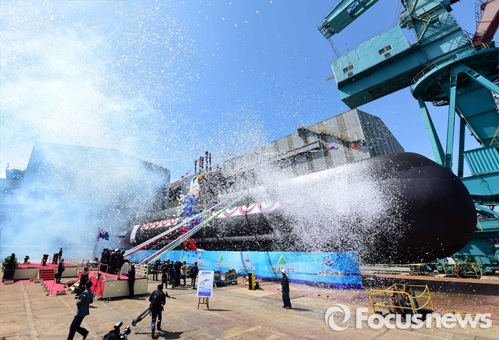 (서울=포커스뉴스) 5일 울산 동구 현대중공업 본사에서 열린 해군의 214급(1,800톤급) 잠수함인 '홍범도함'의 진수식에서 정호섭 참모총장이 축사를 하고 있다. <사진제공=해군>
