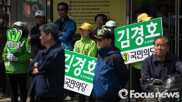 (의정부=포커스뉴스) 국민의당 선거운동원들이 5일 오후 의정부시 태평로 제일시장 앞에서 김경호 의정부갑 후보 지원유세를 하고 있다.