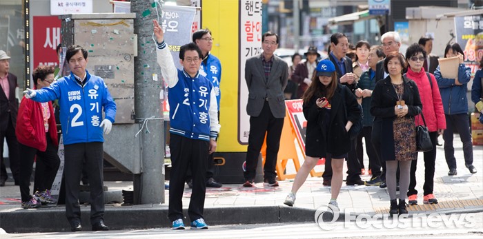 (서울=포커스뉴스) 5일 오후 서울 관악구 서울대입구역 인근에서 유기홍 더불어민주당 관악구갑 후보가 선거유세를 하고 있다.