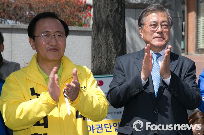 (창원=포커스뉴스) 문재인(오른쪽) 전 더불어민주당 대표가 5일 오후 경남 창원시 성산구 반송시장 앞에서 노회찬 정의당 창원성산 후보 지원유세에 참석해, 노 후보와 박수치고 있다. 노 후보는 창원성산에서 허성무 더불어민주당 후보와 경합에서 승리해, 더민주 · 정의당 단일후보로 출마한다.