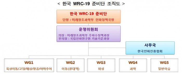 한국 WRC-19 준비단은 ITU(국제전기통신연합)의 WRC-19 연구체계에 맞춰 운영위원회와 5개의 의제연구반으로 구성되며, 국방부·국토부·해양부 등 관련부처 및 산‧학‧연 전문가 100여명이 참여한다.