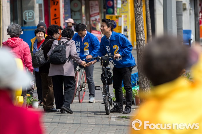 (서울=포커스뉴스) 김영호 더불어민주당 서대문을 후보가 5일 오후 서울 서대문구 백련시장 일대에서 자전거를 타고 주민들을 만나며 한 표를 호소 하고 있다.