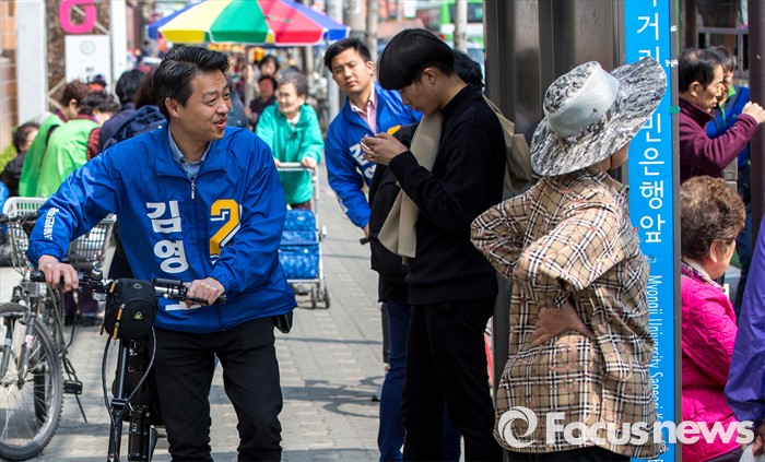 (서울=포커스뉴스) 김영호 더불어민주당 서대문을 후보가 5일 오후 서울 서대문구 백련시장 일대에서 자전거를 타고 주민들을 만나며 한 표를 호소 하고 있다.