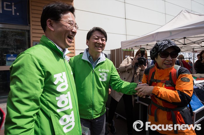 (의정부=포커스뉴스) 안철수 국민의당 상임공동대표(가운데)가 5일 오후 의정부시 금오동에서 정희영 의정부을 후보(왼쪽) 지원유세를 하던 중 한 유권자의 손을 잡고 환하게 웃고 있다.