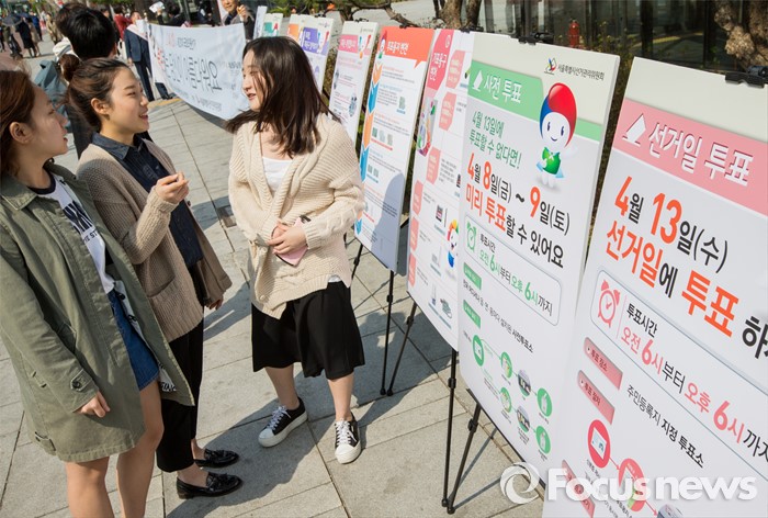 (서울=포커스뉴스) 20대 국회의원선거를 8일 앞둔 5일 오후 서울 종로구 마로니에공원 인근에 설치된 4.13총선 투표참여 홍보자료를 청년 유권자들이 유심히 살펴보고 있다.