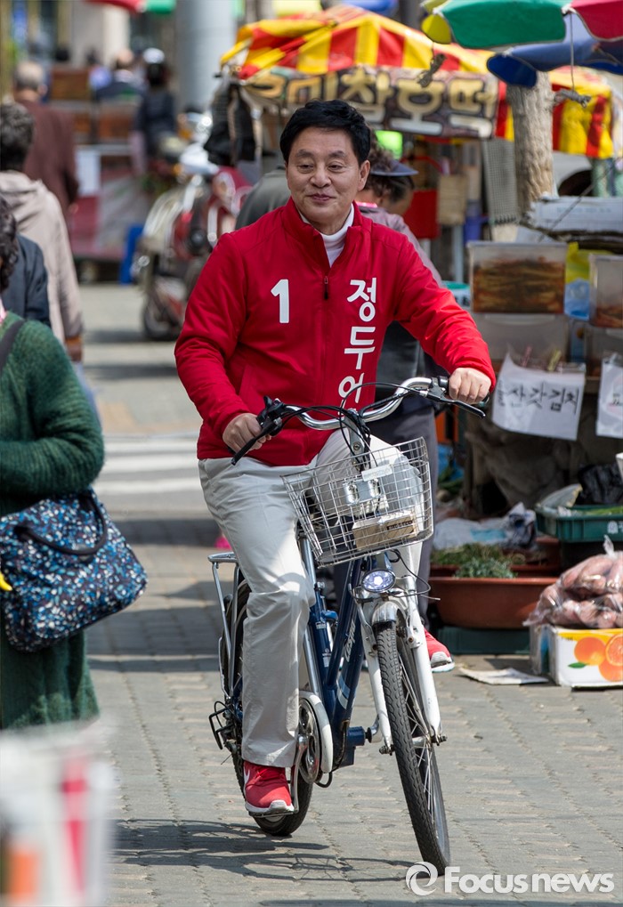 (서울=포커스뉴스) 정두언 새누리당 서대문을 후보가 5일 오후 서울 서대문구 백련시장 일대에서 자전거를 타고 주민들을 만나며 한 표를 호소 하고 있다.