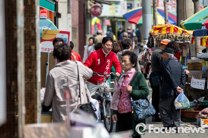 (서울=포커스뉴스) 정두언 새누리당 서대문을 후보가 5일 오후 서울 서대문구 백련시장 일대에서 자전거를 타고 주민들을 만나며 한 표를 호소 하고 있다.