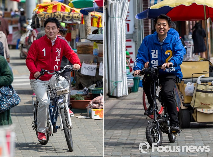(서울=포커스뉴스) 정두언(왼쪽) 새누리당 서대문을 후보와 김영호 더불어민주당 서대문을 후보가 5일 오후 서울 서대문구 백련시장 일대에서 자전거를 타고 주민들을 만나며 한 표를 호소 하고 있다.