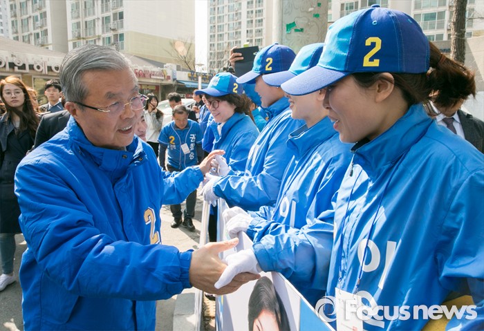 (화성=포커스뉴스) 5일 오후 경기도 화성 봉담읍 하나로마트 앞에서 더불어민주당 화성지역 합동유세를 마친 김종인 비대위 대표 겸 선대위원장이 선거운동원들을 격려하며 악수하고 있다.