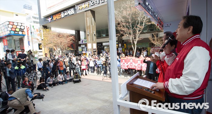 (청주=포커스뉴스) 김무성 새누리당 대표가 5일 오후 충북 청주 성안길에서 정우택, 최현호, 오성균 후보의 지지를 호소하고 있다.
