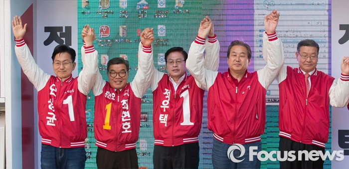 (청주=포커스뉴스) 김무성 새누리당 대표가 5일 오후 충북 청주 성안길에서 정우택, 최현호, 오성균 후보의 지지를 호소하고 있다.