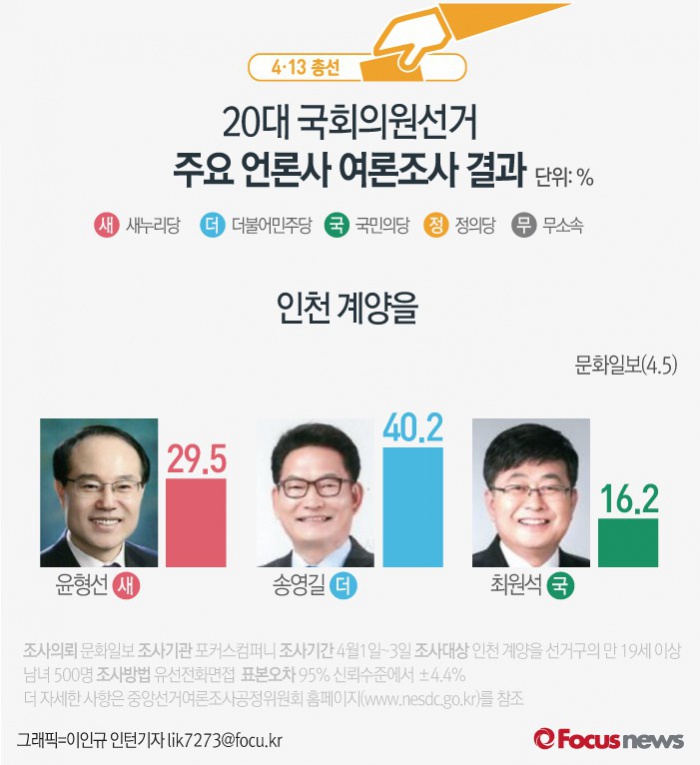 문화일보가 여론조사기관인 포커스컴퍼니에 의뢰해 5일 발표한 결과에 따르면 인천 계양을에서 더민주 송영길 후보의 지지율은 40.2%로 새누리 윤형선 후보 지지율 29.5%보다 높았다. 두 후보간 지지율 격차는 10.7%p로 나타났다.