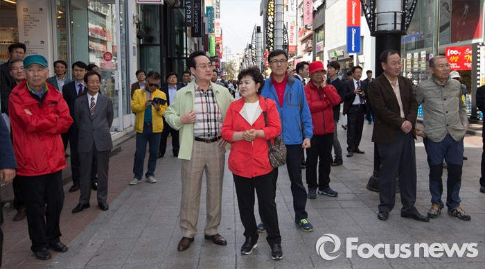 (청주=포커스뉴스) 5일 오후 충북 청주 성안길에서 시민들이 김무성 새누리당 대표 지지호소를 바라보고 있다.