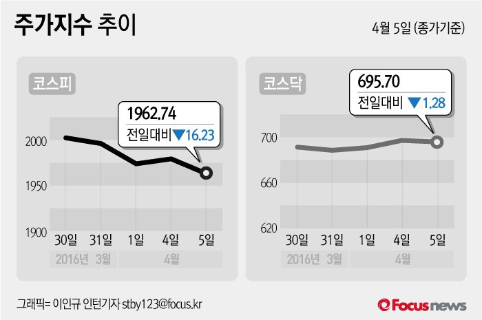 (서울=포커스뉴스) 5일 코스피지수는 전날 보다 0.82%(16.23포인트) 내린 1962.74에 장을 마쳤다. 코스닥지수는 전일 대비 0.18%(1.28포인트) 내린 695.70에 마감했다.