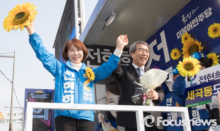 (서울=포커스뉴스) 20대 총선에 출마한 전현희 더불어민주당 강남을 후보가 5일 오후 서울 수서역 인근에서 전 후보의 고문으로 활동하기로 한 정운찬 전 국무총리와 함께 유권자들에게 지지를 호소하고 있다.