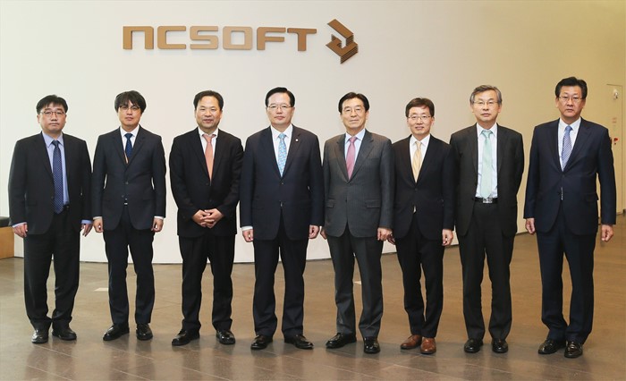 (서울=포커스뉴스) 정의화(왼쪽 네번째) 국회의장이 5일 오전 경기도 성남 분당구 엔씨소프트를 방문해 관계자들과 기념촬영을 하고 있다. <사진제공=국회>