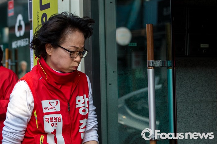 (서울=포커스뉴스) 황춘자 새누리당 용산구 후보가 5일 오후 서울 용산구 이태원동 일대에서 유세를 하기 위해 상점으로 들어서고 있다.