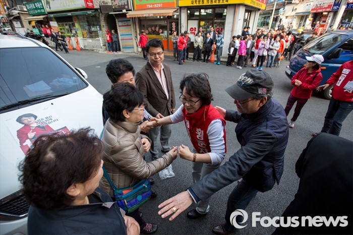 (서울=포커스뉴스) 황춘자 새누리당 용산구 후보가 5일 오후 서울 용산구 이태원동 일대에서 유세를하며 주민들에게 한 표를 호소 하고 있다.