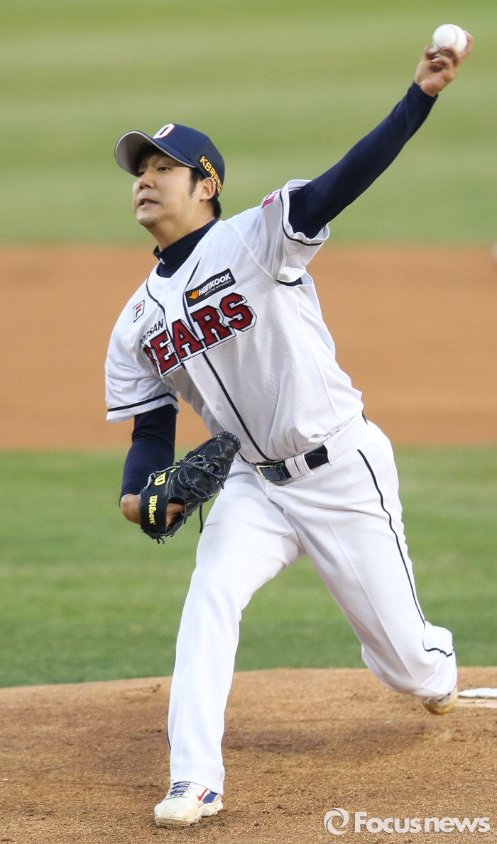 (서울=포커스뉴스) 5일 서울 잠실구장에서 열린 2016프로야구 NC-두산 경기에서 1회초 두산 선발투수 장원준이 투구하고 있다.