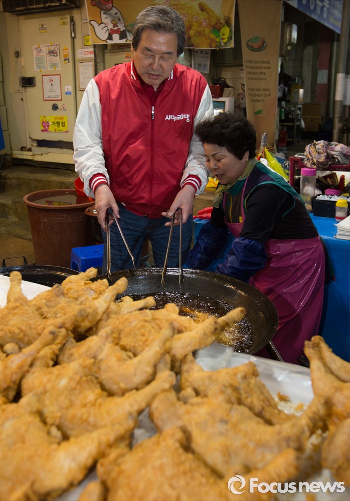 (세종=포커스뉴스) 김무성 새누리당 대표가 5일 오후 세종시 조치원읍 세종전통시장을 방문, 통닭을 튀기고 있다.