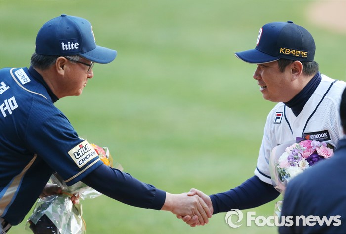 (서울=포커스뉴스) 5일 서울 잠실구장에서 열린 2016프로야구 NC-두산 잠실 개막 경기에서 NC 김경문 감독(왼쪽)과 두산 김태형 감독이 악수하고 있다.
