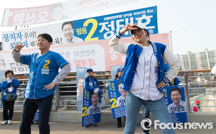 (서울=포커스뉴스) 5일 오후 서울 관악구 삼성동시장 앞에서 더컸유세단이 정태호 더불어민주당 관악구을 후보 지원유세를 하고 있다.