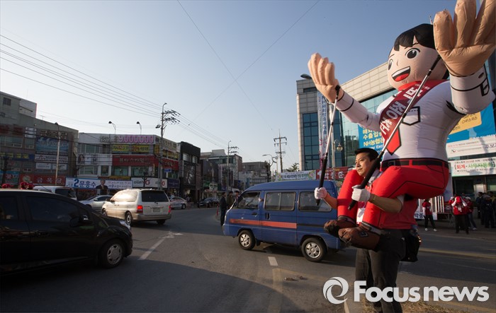 (세종=포커스뉴스) 5일 오후 세종시 조치원읍 조치원역 앞 교차로에서 선거운동원들이 박종준 후보의 지지를 호소하고 있다.