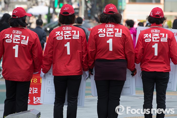 (서울=포커스뉴스) 5일 오후 서울 건대입구역 인근에서 20대 총선에 출마한 정준길 새누리당 광진을 후보의 선거운동원들이 유권자들에게 지지를 호소하고 있다.