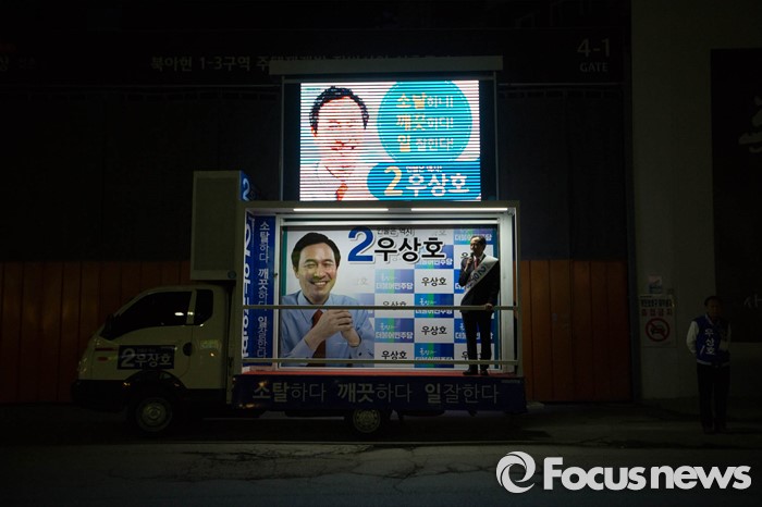| △ 어두운 밤 밝히는 우상호 후보의 선거차량 |