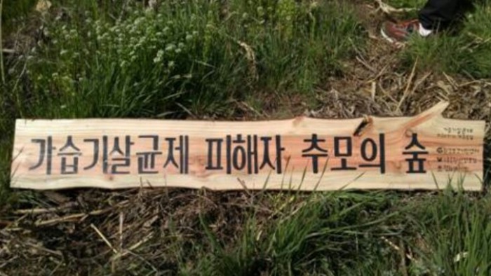 이어 1289명 가습기살균제 생존자의 쾌유를 비는 나무심기를 이어가 '가습기살균제 피해자 추모의 숲'을 만들 계획이라고 말했다.가습기살균제 피해자 추모의 숲 현판. <사진제공=환경보건시민센터>